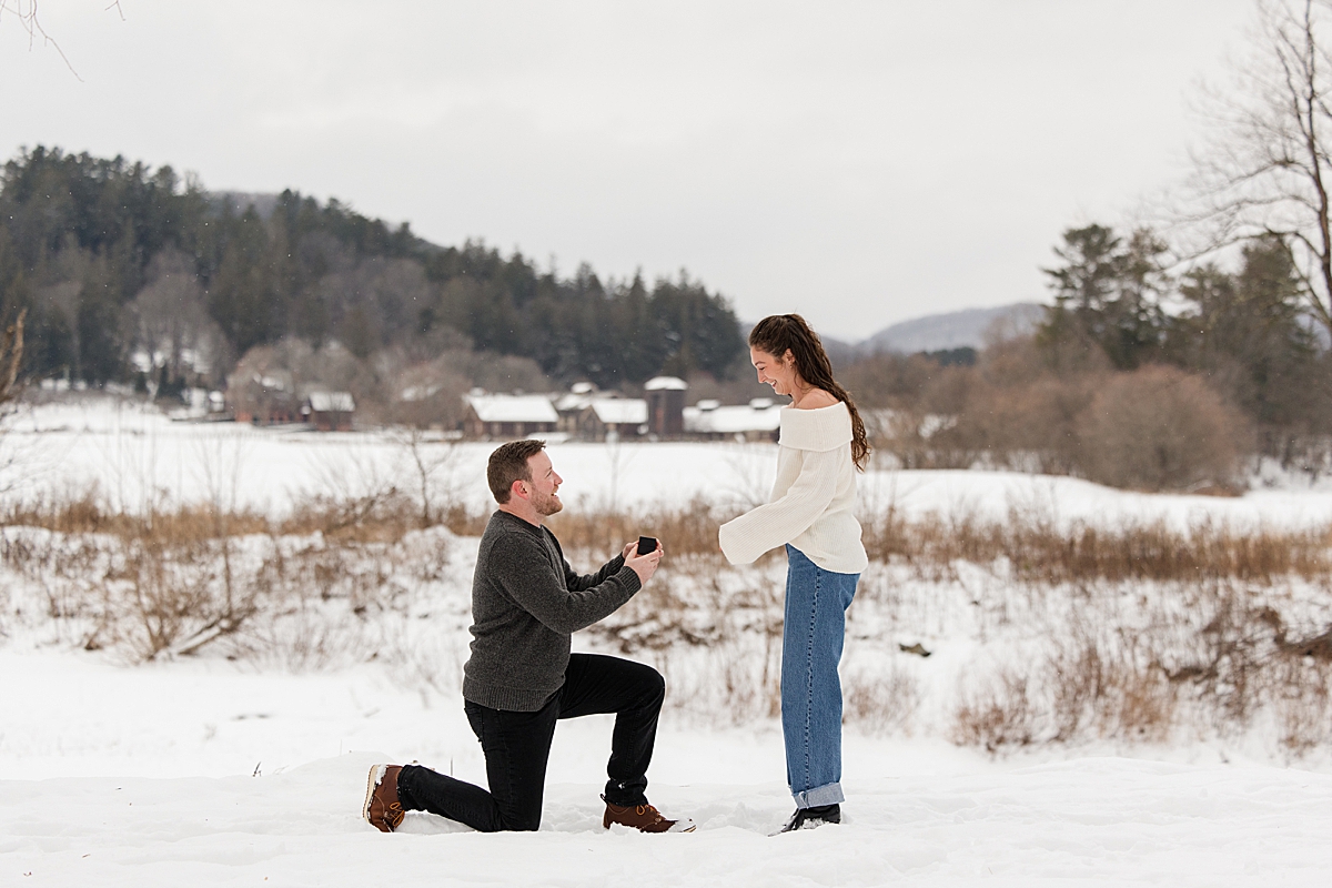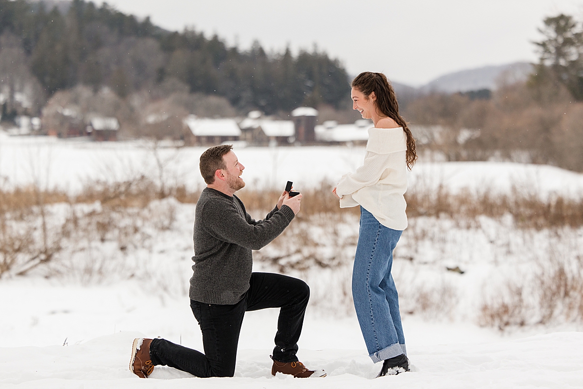 Woodstock, VT in winter is peaceful and timeless, making it the perfect place for an intimate proposal. On this chilly, December afternoon, with fresh snow on the ground and the hills in the distance, Aiden dropped to one knee and asked Katie to marry him. Her reaction was pure joy—surprised, emotional, and full of laughter as she said yes.