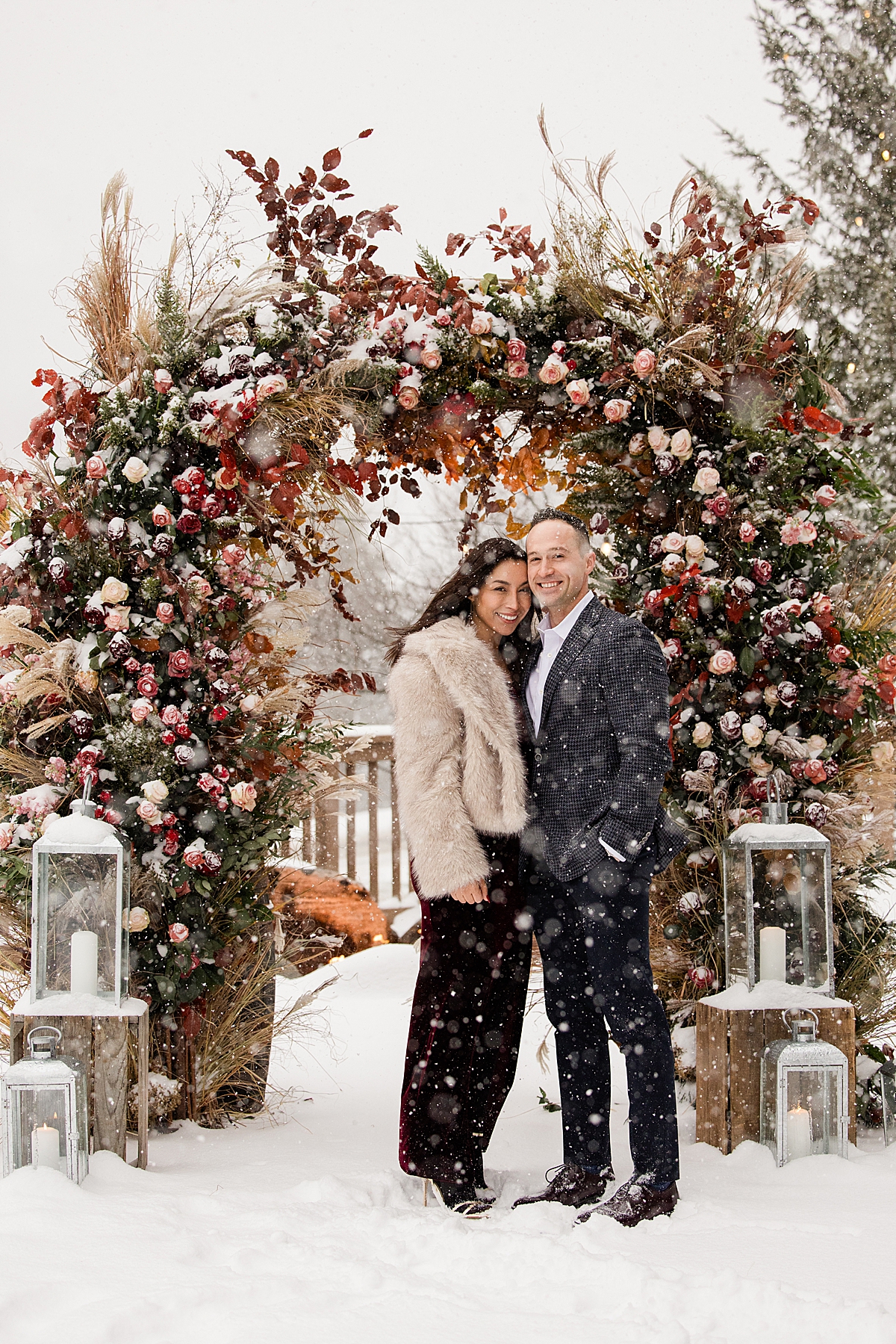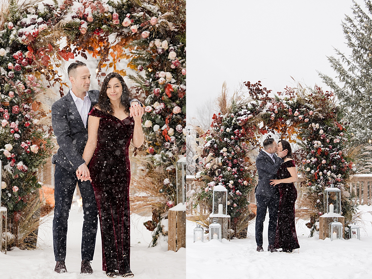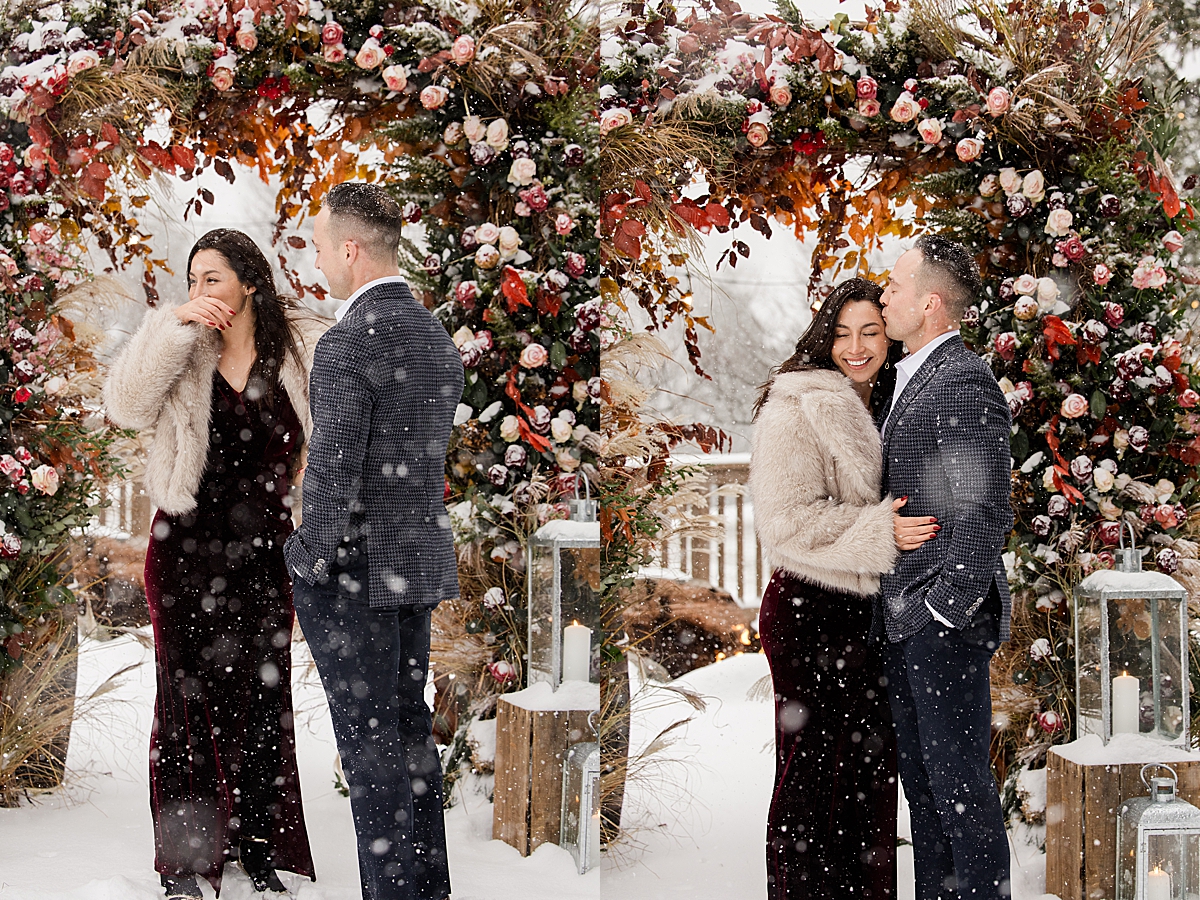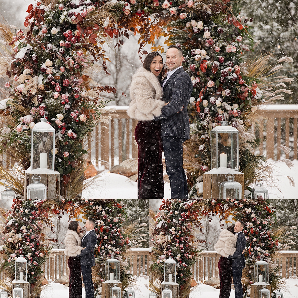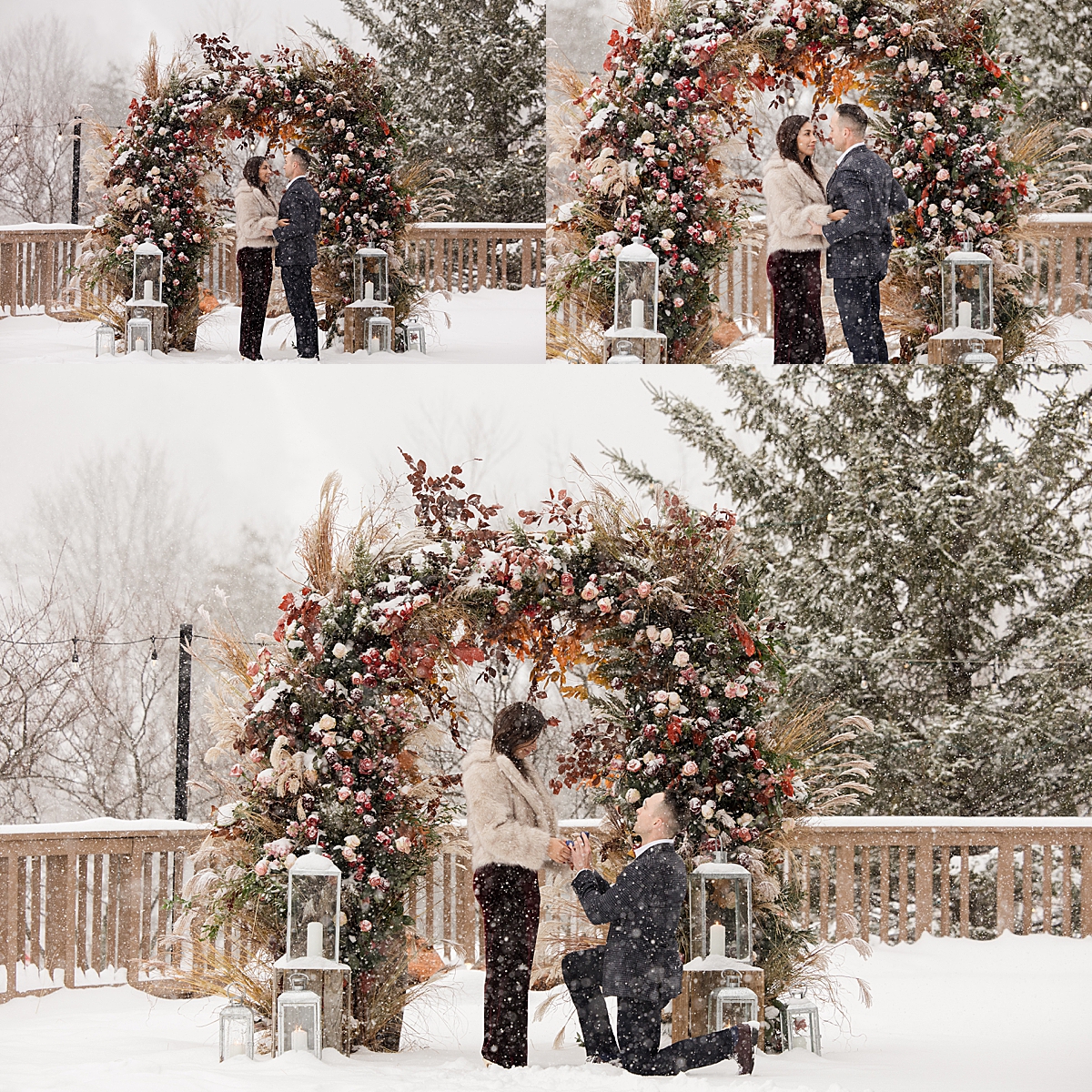Snow fell around them as he dropped to one knee, framed by one of the most stunning floral arches imaginable. This winter proposal at Spruce Peak in Stowe, Vermont felt like something straight out of a Hallmark movie.