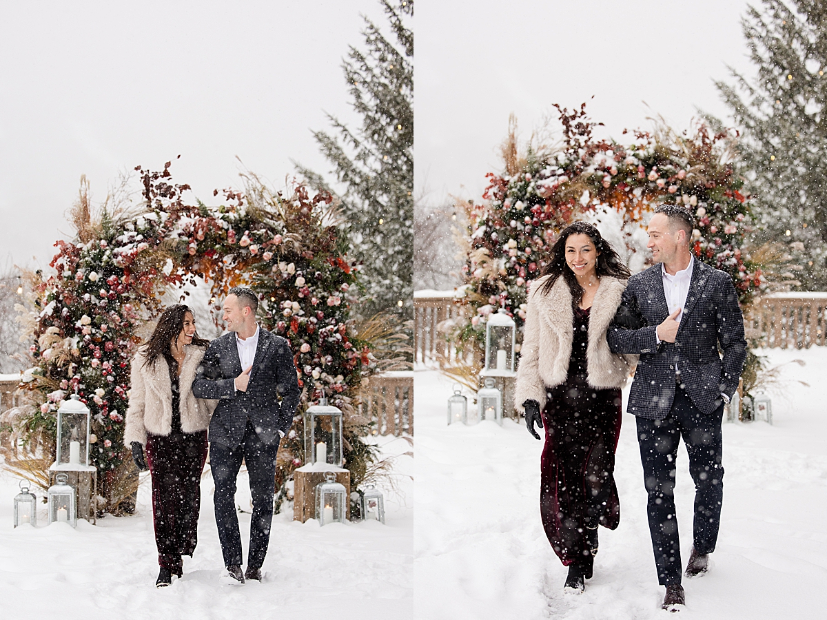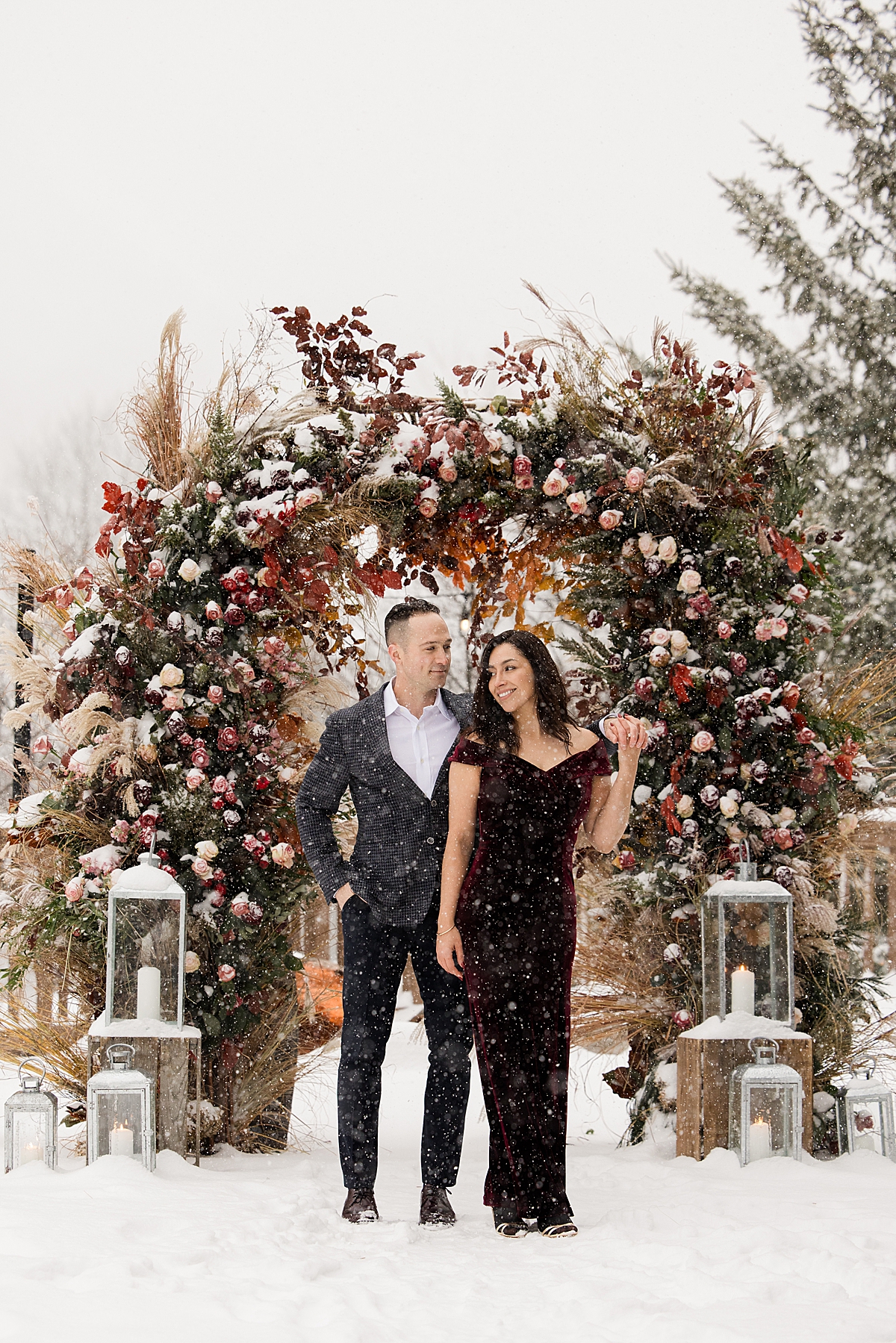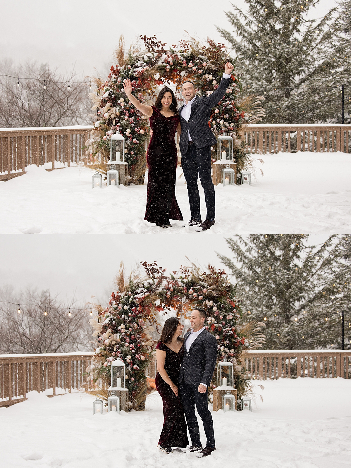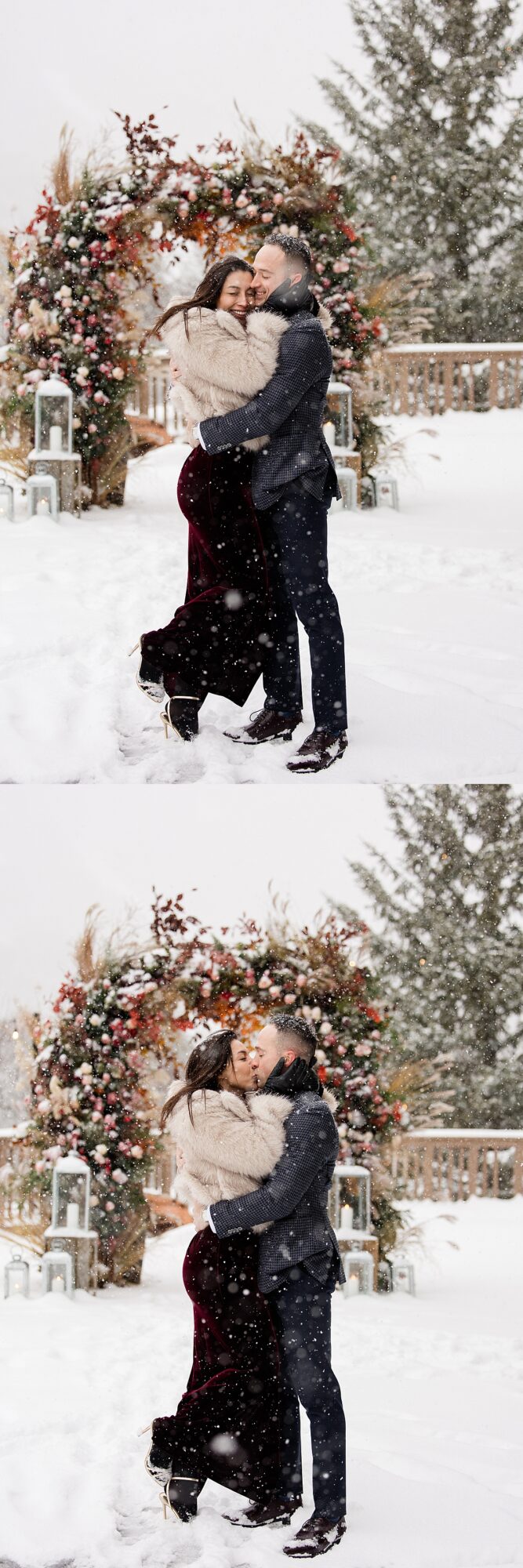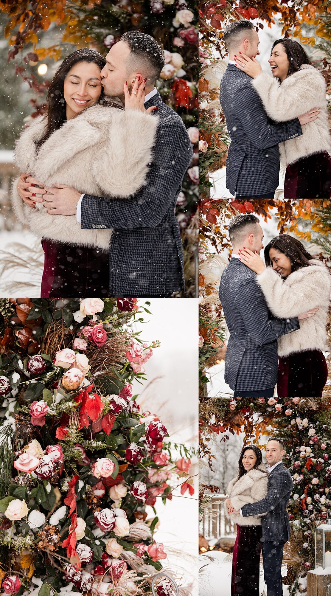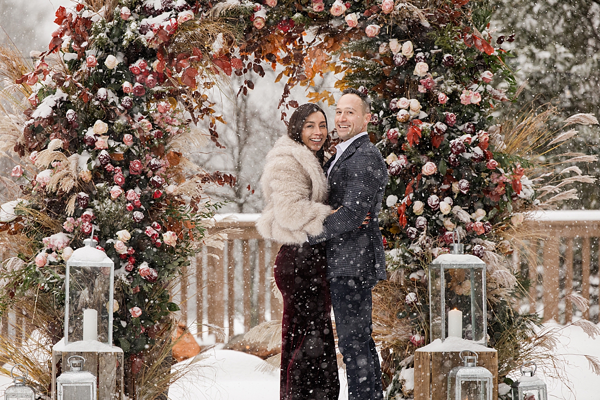 Snow fell around them as he dropped to one knee, framed by one of the most stunning floral arches imaginable. This winter proposal at Spruce Peak in Stowe, Vermont felt like something straight out of a Hallmark movie.