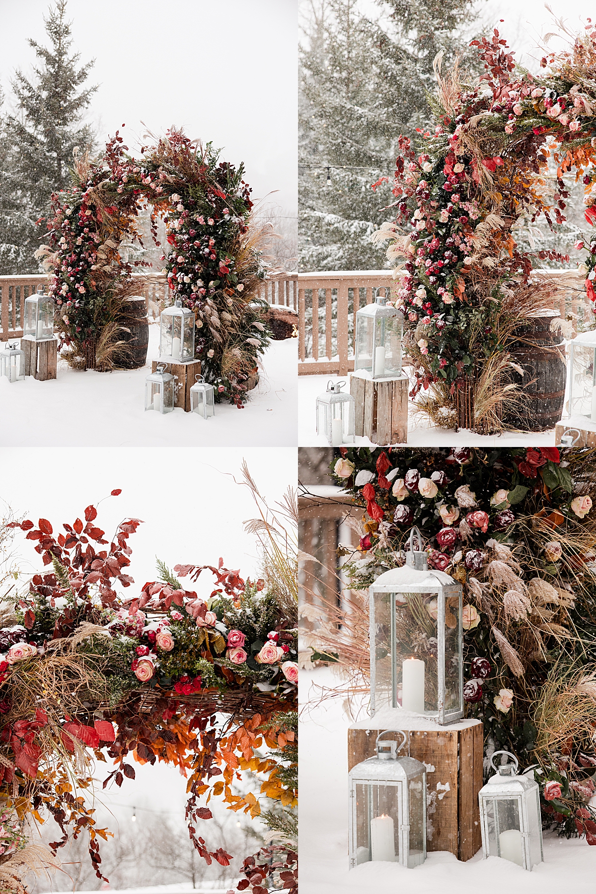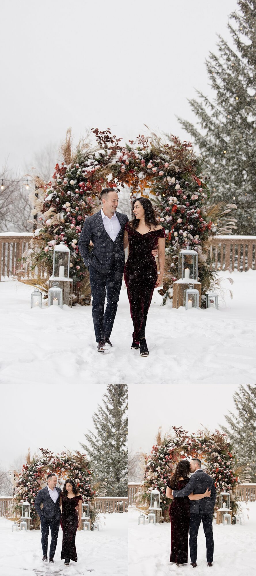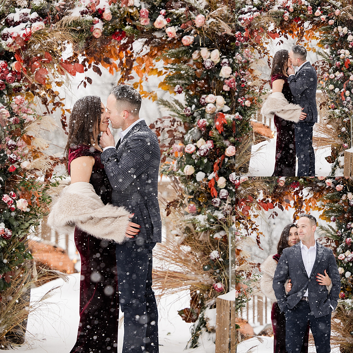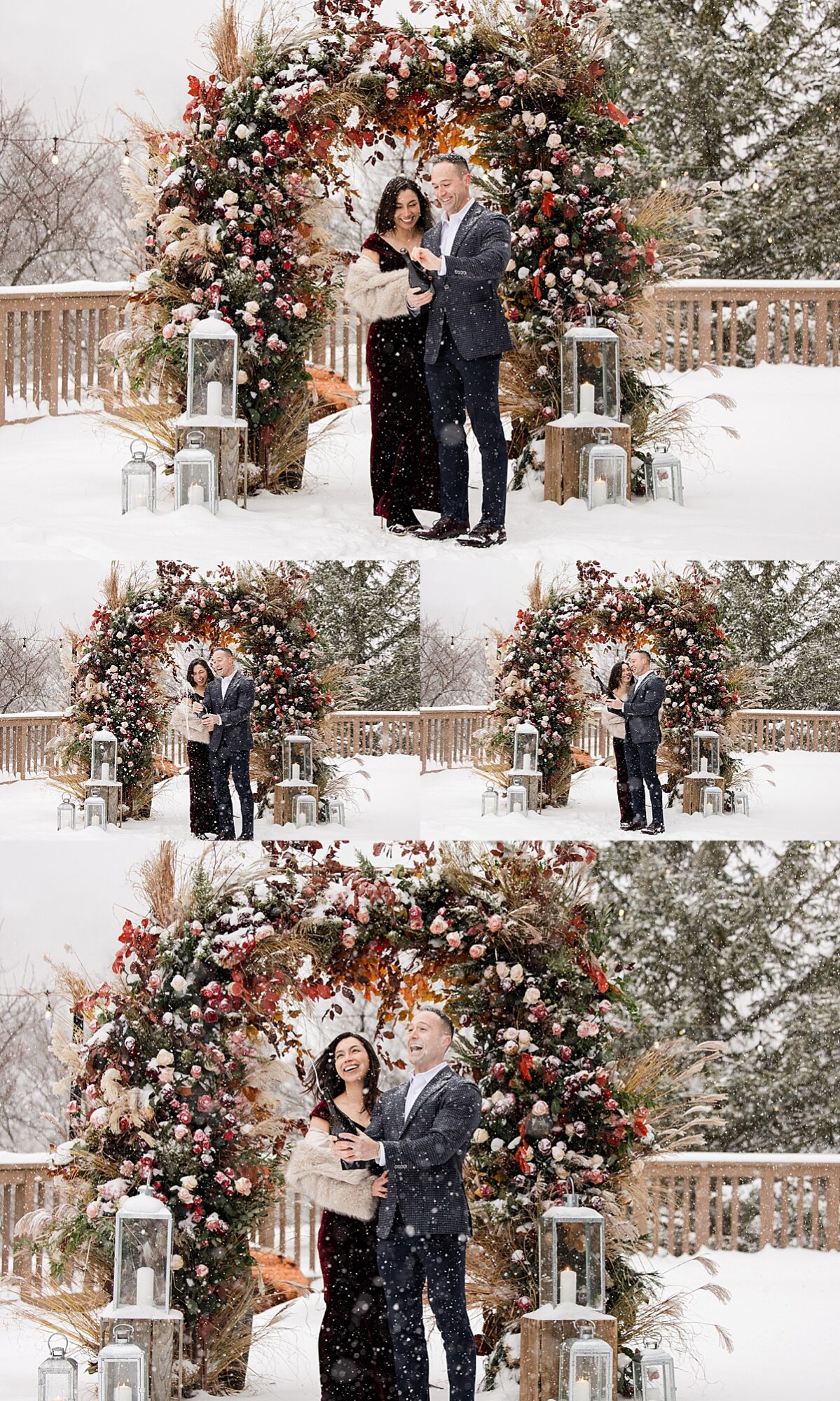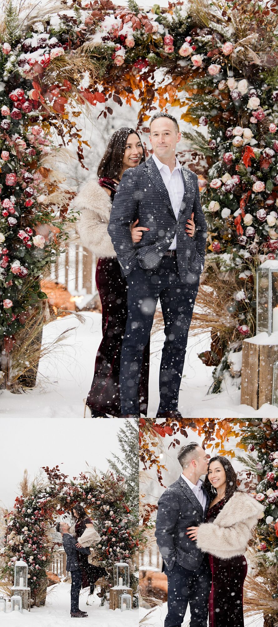Snow fell around them as he dropped to one knee, framed by one of the most stunning floral arches imaginable. This winter proposal at Spruce Peak in Stowe, Vermont felt like something straight out of a Hallmark movie.