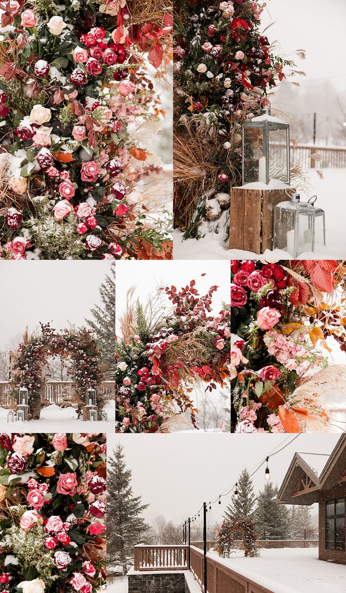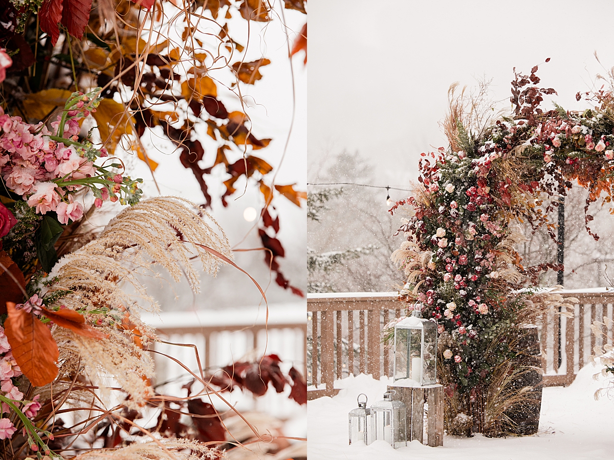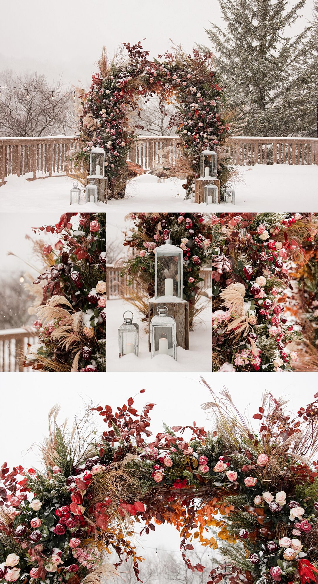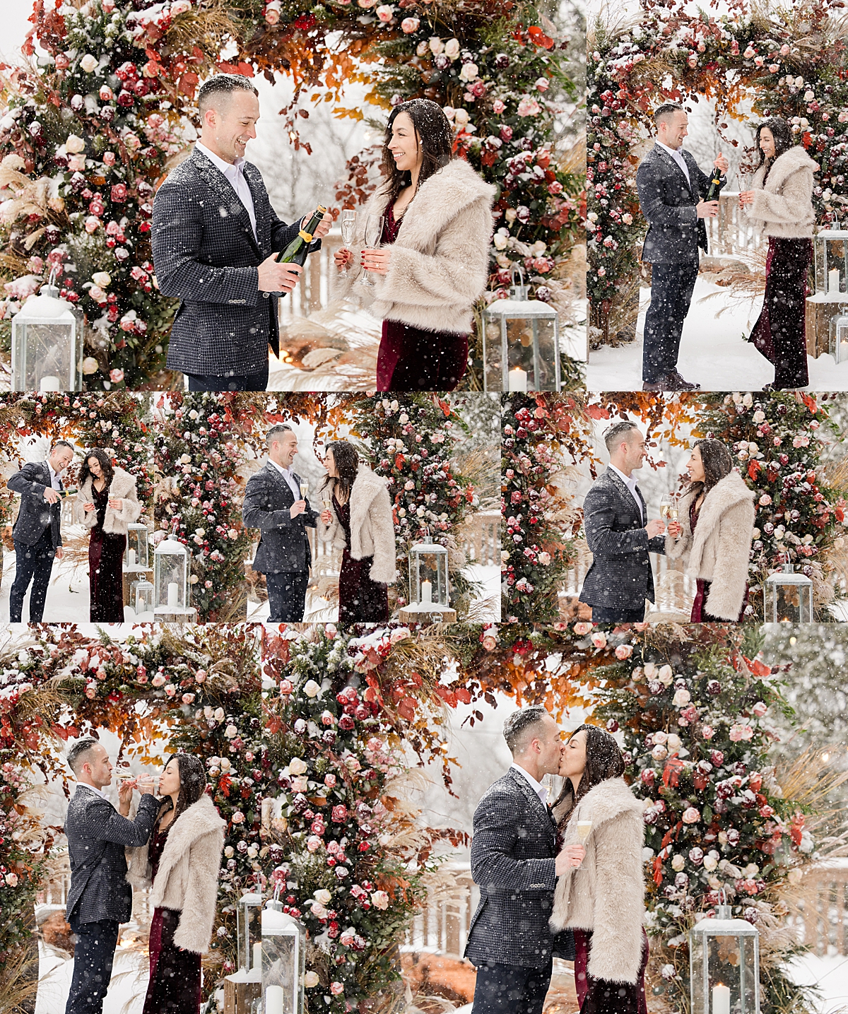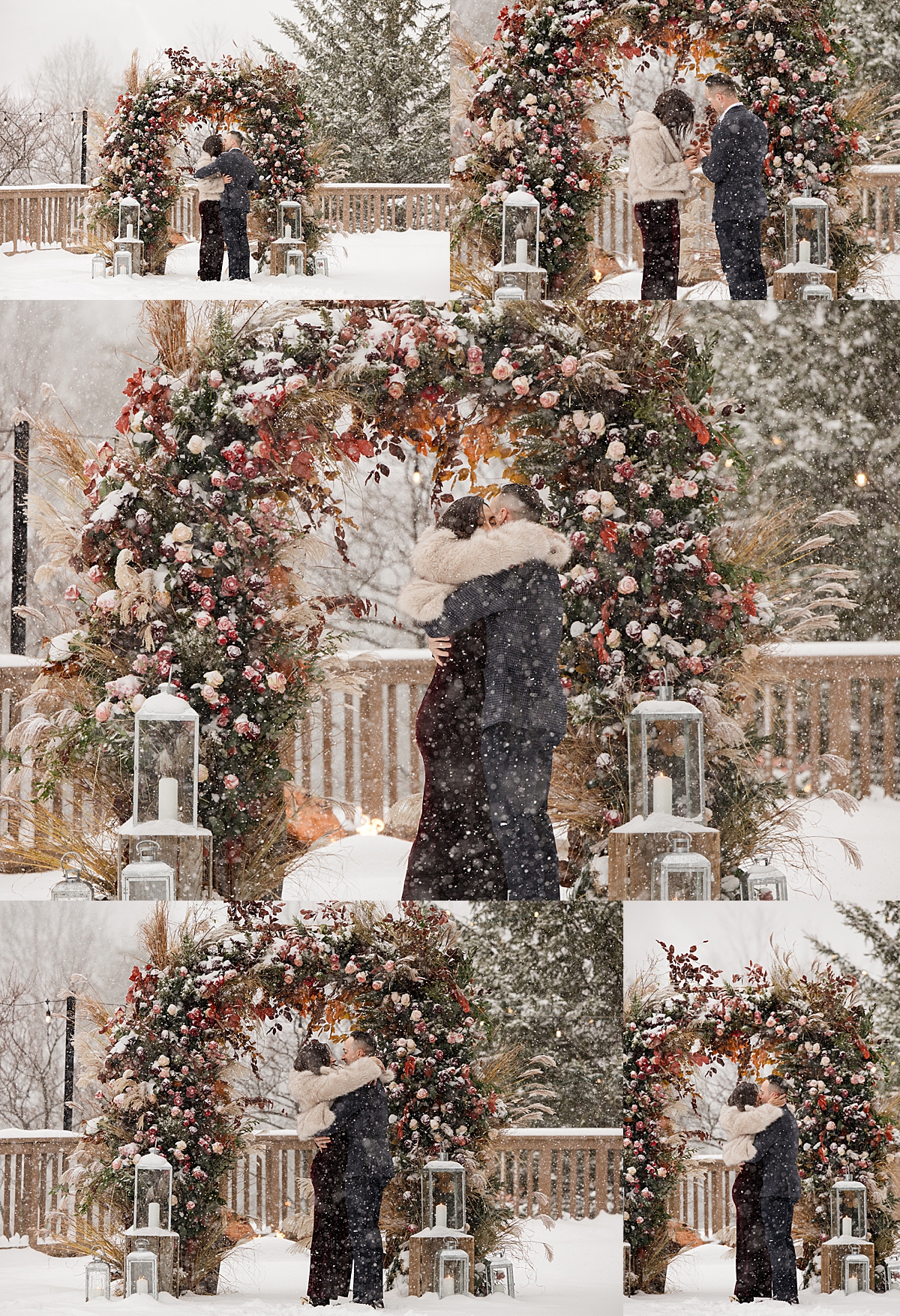 Snow fell around them as he dropped to one knee, framed by one of the most stunning floral arches imaginable. This winter proposal at Spruce Peak in Stowe, Vermont felt like something straight out of a Hallmark movie.