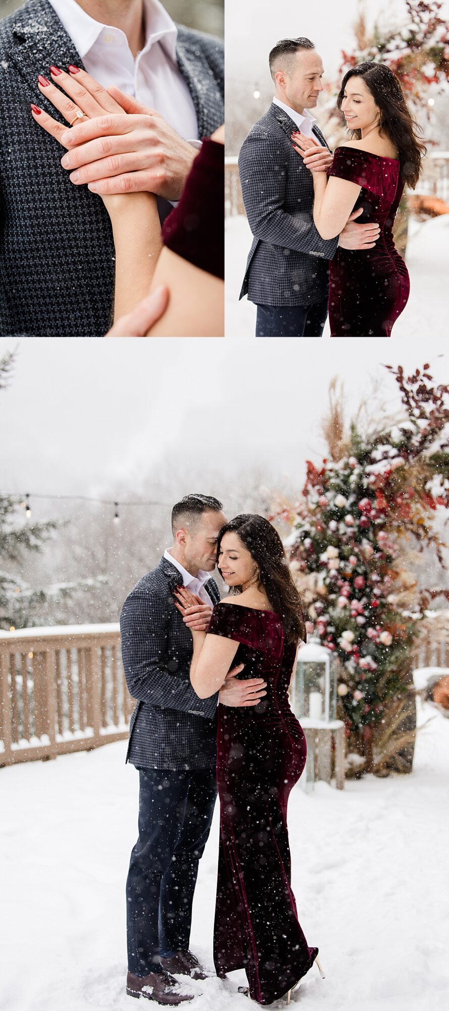 As the snow continued to fall, time seemed to slow. Wrapped in each other’s arms, with snow swirling all around them, they shared an intimate, unforgettable moment surrounded by the peaceful beauty of Stowe – a timeless beginning to their engagement story in Vermont